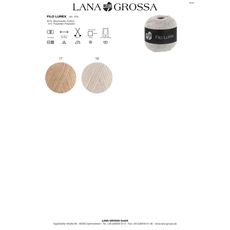 Lana Grossa Filo Lurex vereint sommerliche Leichtigkeit mit einem Hauch Glamour. Das feine Garn mit eingearbeitetem Lurexfaden sorgt für dezenten Glanz. Ideal für Tops, Pullover und Accessoires mit eleganter Note – luftig, weich und perfekt für die warme Jahreszeit.