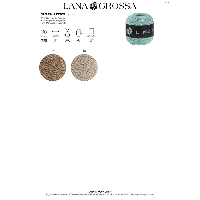 Lana Grossa Filo Paillettes ist ein feines, leichtes Effektgarn, das mit dezent eingearbeiteten Pailletten für stilvolle Glanzakzente sorgt. Es eignet sich perfekt, um schlichte Maschen edel in Szene zu setzen – ob bei Pullovern, Tüchern oder festlichen Accessoires. Für Projekte mit einem Hauch Glamour und feinem Funkeln.