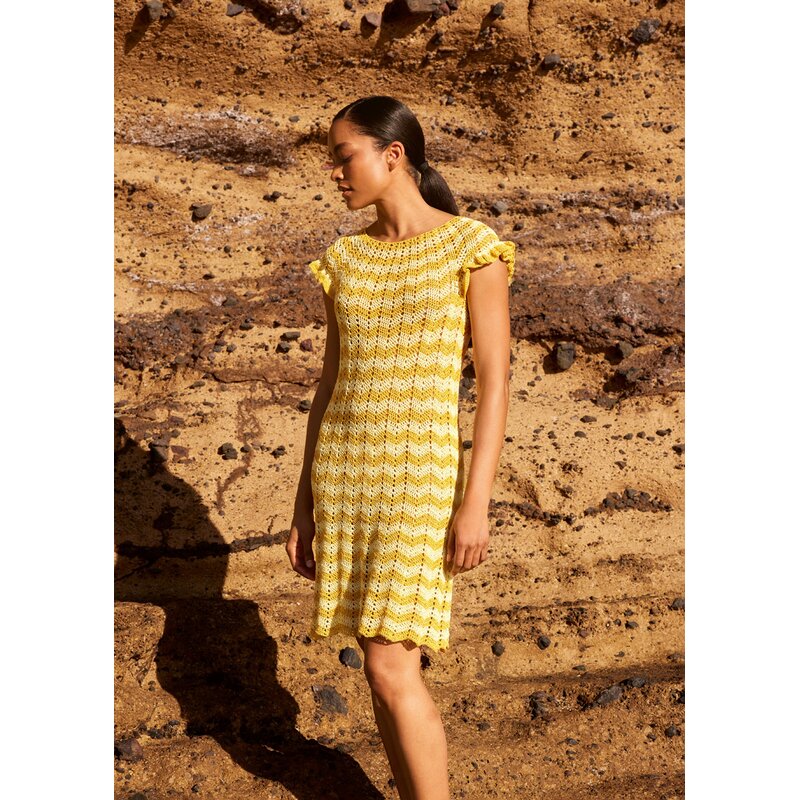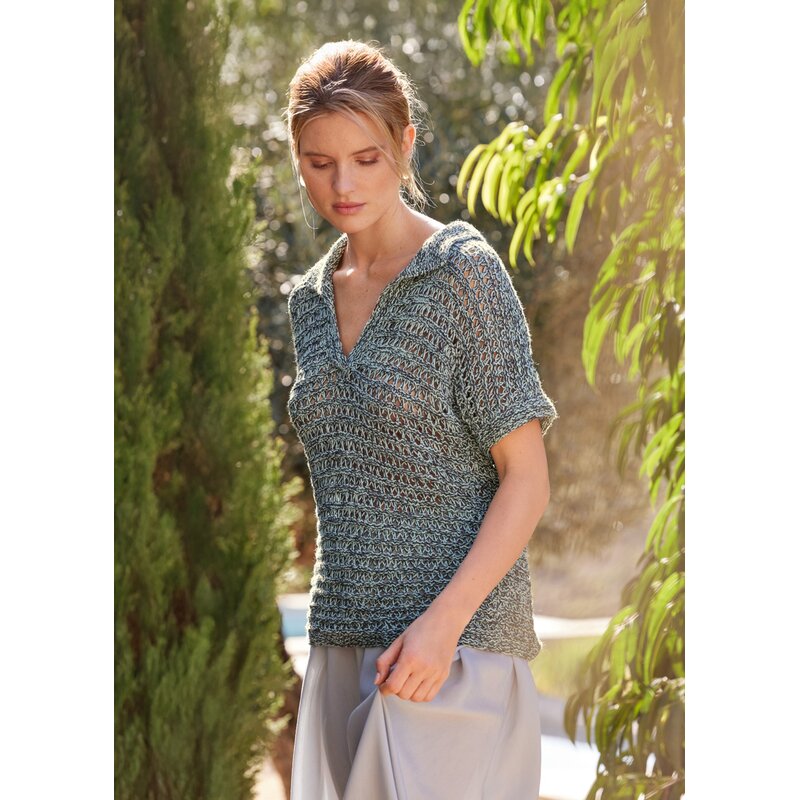 Hochwertige Baumwollfäden werden, zusammen mit einem Faden winziger Pailletten, zu einem dünnen Garn gedreht. Ton-in-Ton gefärbt, setzen sie dezent schimmernde Glanzpunkte.